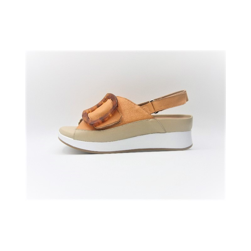 Sandalia de piel de color naranja con velcro delantero y trasero ajustable, ideal para anchos especiales, plantillas extraíbles y cuña de 2 cm. En caso de no encontrar tu número ponte en contacto con nosotros.