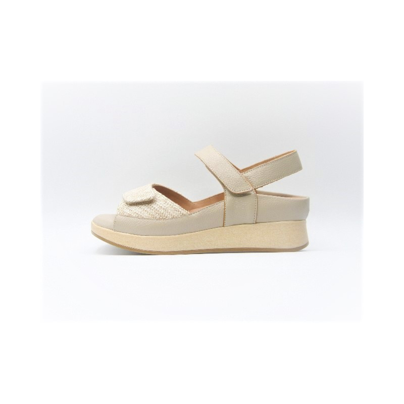 Sandalia de piel grabada de color taupe con velcros delanteros ajustables, cerrado trasero, ideal para anchos especiales, plantillas extraíbles y cuña de 2 cm. En caso de no encontrar tu número ponte en contacto con nosotros.