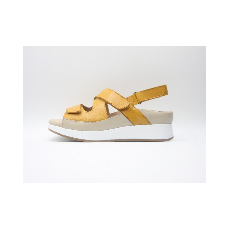 Sandalia de piel de color mostaza con doble velcro delantero y trasero ajustables, ideal para anchos especiales, plantillas extraíbles y cuña de 2 cm. En caso de no encontrar tu número ponte en contacto con nosotros.
