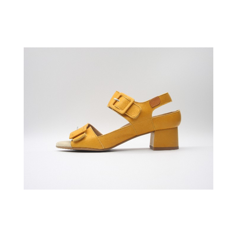 Sandalia de piel de color mostaza con doble tira con velcros ajustables, cerrado trasero, especial para plantillas extraíbles y tacón de 4 cm. En caso de no encontrar tu número ponte en contacto con nosotros.