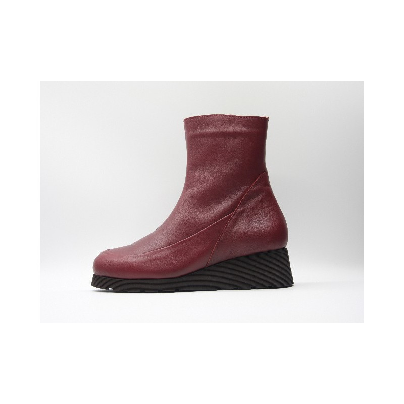 Botín de piel de color burdeos con cremallera ajustable, refuerzo delantero y trasero, especial para plantillas extraíbles y cuña de 3 cm. En caso de no encontrar tu número disponible ponte en contacto con nosotros.