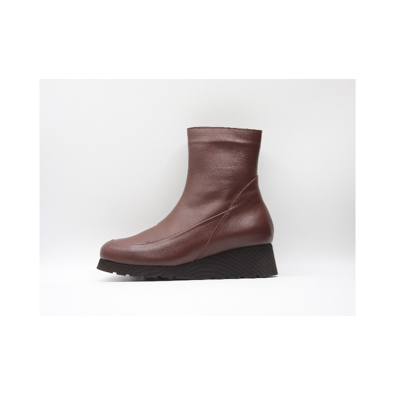 Botín de piel de color cuero con cremallera ajustable, refuerzo delantero y trasero, especial para plantillas extraíbles y cuña de 3 cm. En caso de no encontrar tu número disponible ponte en contacto con nosotros.