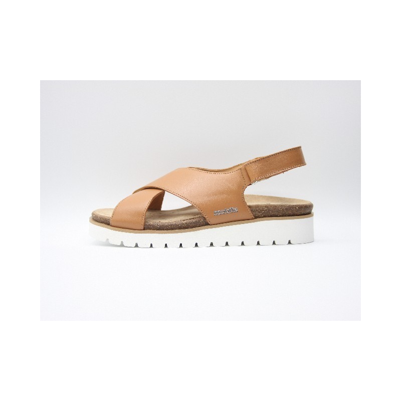 Sandalia de piel de color camel con tiras cruzadas delanteras, velcro trasero ajustable, ideal para anchos especiales, plantillas extraíbles y cuña de 2 cm. En caso de no encontrar tu número ponte en contacto con nosotros.
