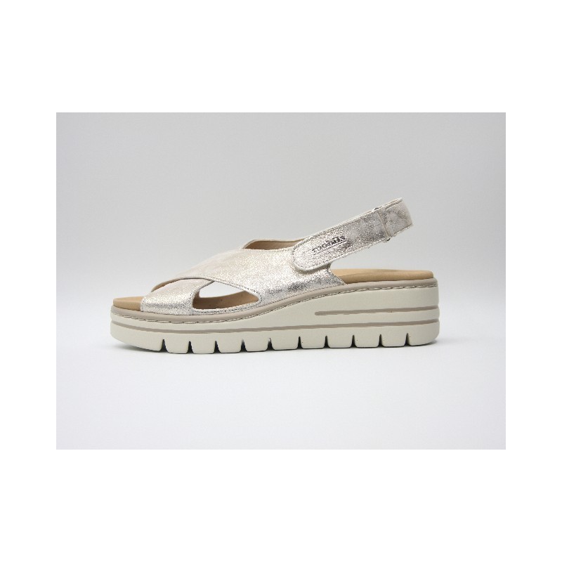 Sandalia de de piel de color dore con tiras delanteras cruzadas, velcro trasero, ideal para anchos especiales, plantillas extraíbles y cuña de 2 cm. En caso de no encontrar tu número ponte en contacto con nosotros.