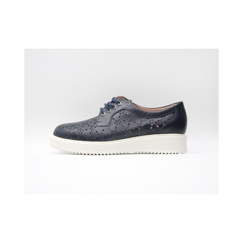 Cordón de piel grabada de color marino con cordones delanteros ajustables, refuerzo trasero, especial para plantillas extraíbles y cuña de 2 cm. En caso de no encontrar tu número ponte en contacto con nosotros.