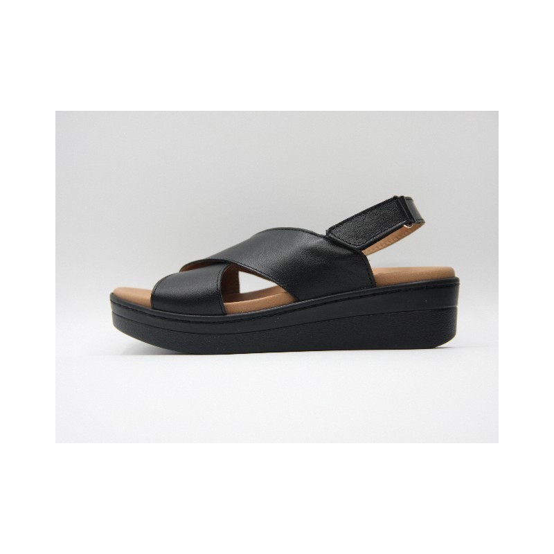 Sandalia de piel de color negro con tiras cruzas y velcro delantero ajustable, ideal para anchos especiales, plantillas extraíbles y cuña de 3 cm. En caso de no encontrar tu número ponte en contacto con nosotros.