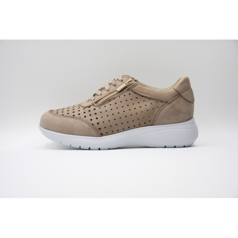 Cordón de nubuck de color beige con cordones y cremallera ajustables, refuerzo delantero y trasero, especial para anchos especiales y cuña de 2 cm. En caso de no encontrar tu número ponte en contacto con nosotros.