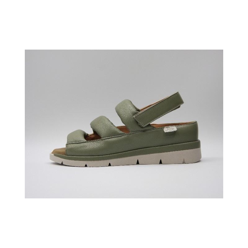 Sandalia de piel de color verde con velcro trasero ajustable, especial para plantillas extraíbles y cuña de 2 cm. En caso de no encontrar tu número ponte en contacto con nosotros.