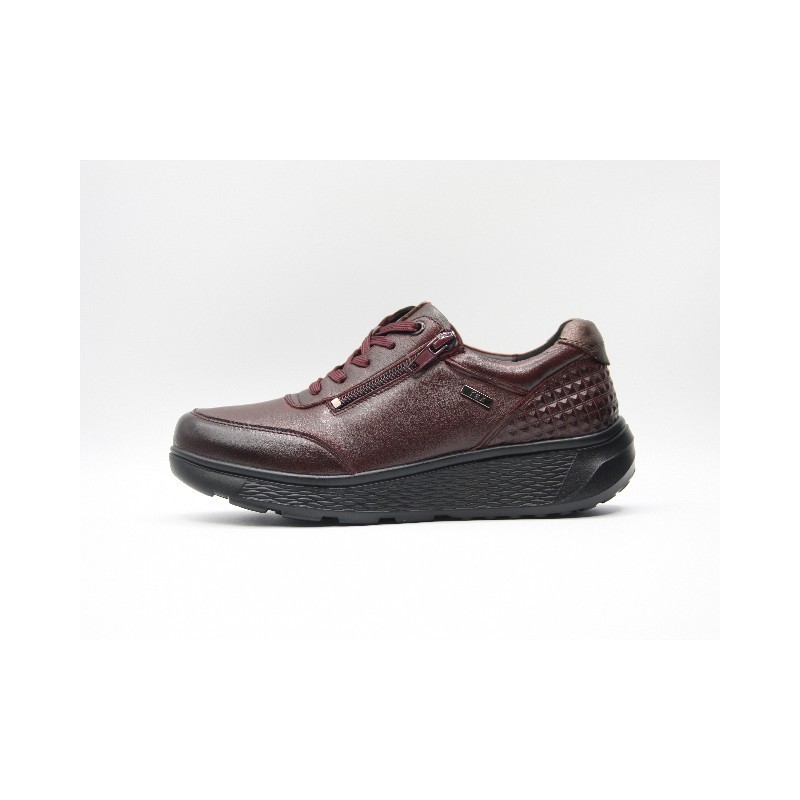 Cordón de piel de color burdeos con cordones y cremallera ajustables, refuerzo delantero y trasero, ideal para anchos especiales, plantillas extraíbles y cuña de 2 cm. En caso de no encontrar tu número ponte en contacto con nosotros.