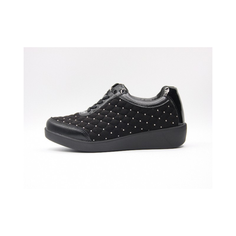 Cordón de nubuck de color negro con cordones delanteros ajustables, refuerzo delantero y trasero, especial para plantillas extraíbles y cuña de 2 cm. En caso de no encontrar tu número ponte en contacto con nosotros.