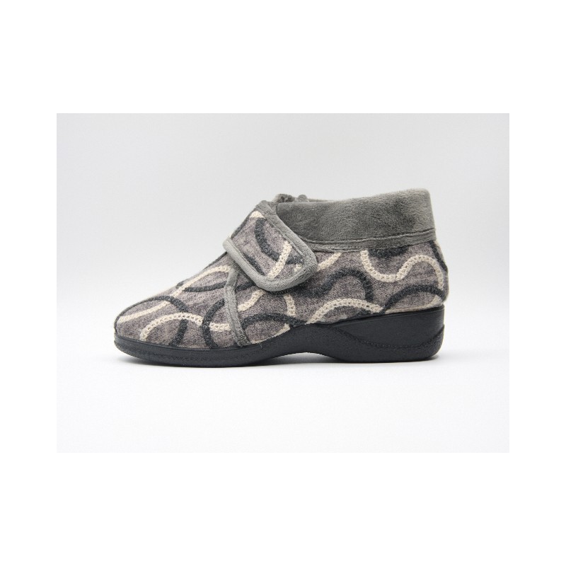 Botín textil de color gris con velcro delantero ajustable, refuerzo trasero, ideal para anchos especiales y plantillas extraíbles. En caso de no encontrar tu número disponible ponte en contacto con nosotros.