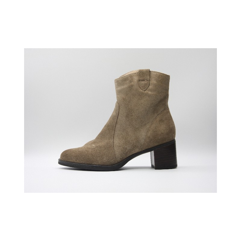 Botín de nobuck de color taupe con cremallera ajustable, refuerzo delantero y trasero, ideal para anchos especiales, plantillas extraíbles y tacón de 4 cm. En caso de no encontrar tu número disponible ponte en contacto con nosotros.