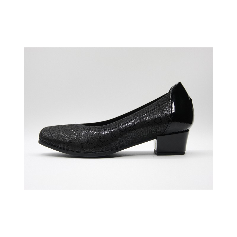 Salón de piel de color negro con refuerzo trasero, ideal para anchos especiales, plantillas extraíbles y tacón de 3 cm. En caso de no encontrar tu número disponible ponte en contacto con nosotros.Recipiente :
