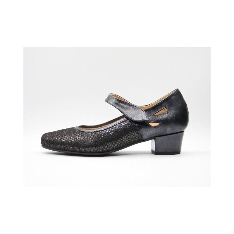 Mercedes de piel de color negro con velcro delantero ajustable, refuerzo trasero, ideal para anchos especiales, plantillas extraíbles y tacón de 3 cm. En caso de no encontrar tu número ponte en contacto con nosotros.Recipiente :