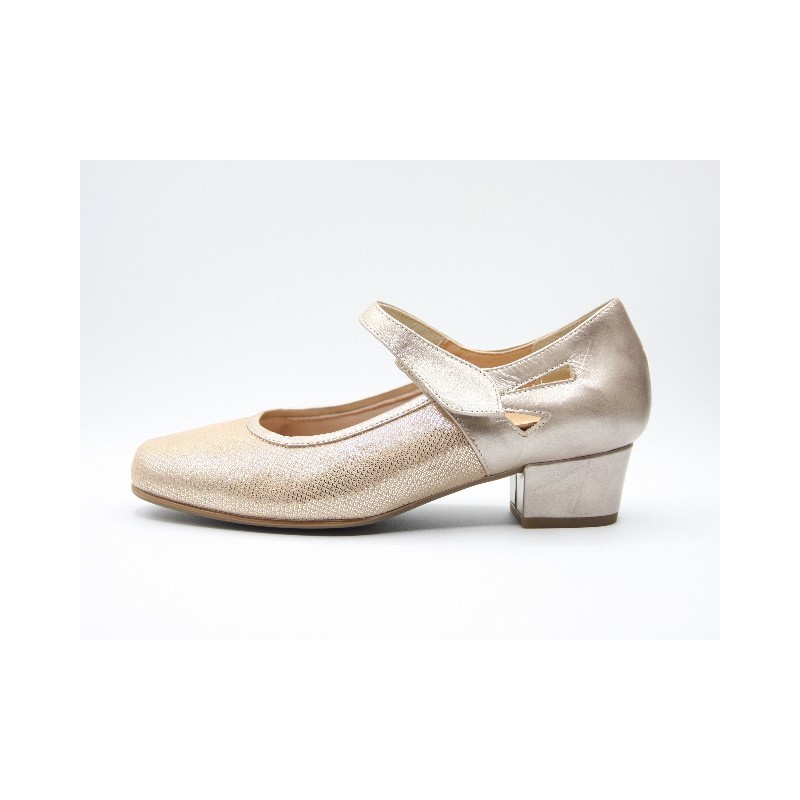 Mercedes de piel de color dorado con velcro delantero ajustable, refuerzo trasero, ideal para anchos especiales, plantillas extraíbles y tacón de 3 cm. En caso de no encontrar tu número ponte en contacto con nosotros.Recipiente :
