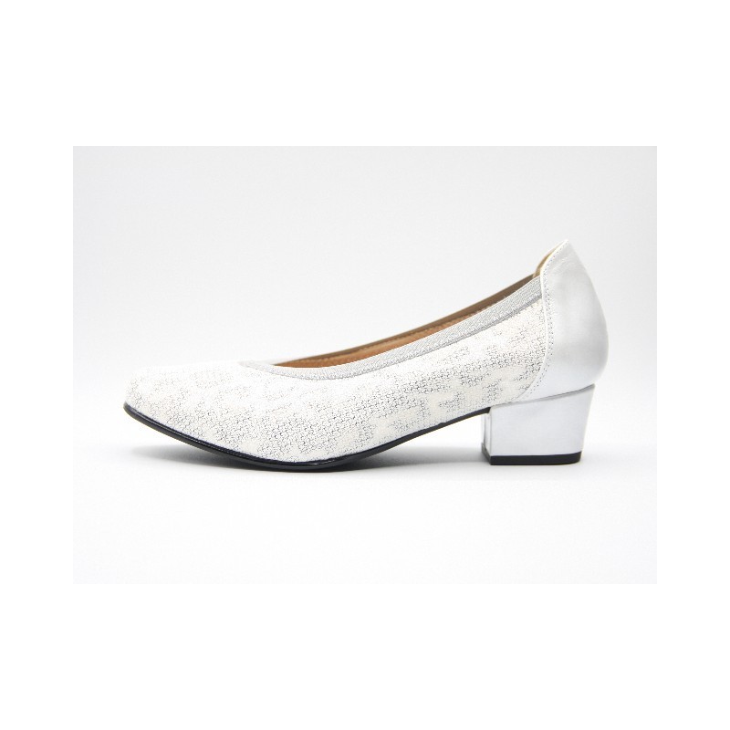 Salón de piel de color plata con refuerzo trasero, ideal para anchos especiales, plantillas extraíbles y tacón de 3 cm. En caso de no encontrar tu número ponte en contacto con nosotros.Recipiente :