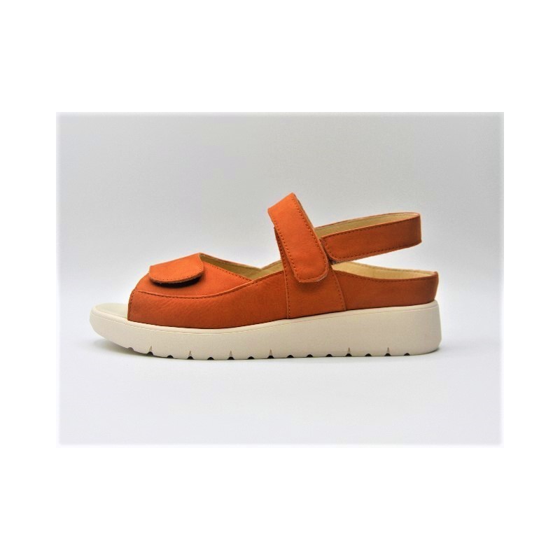 Sandalia de nobuck de color naranja con doble velcro delantero y trasero ajustables, ideal para anchos especiales, plantillas extraíbles y cuña de 2 cm. En caso de no encontrar tu número ponte en contacto con nosotros.Recipiente :