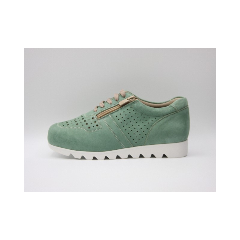 Cordón de nobuck de color verde pálido con cordones y cremallera delantera ajustables, refuerzo delantero y trasero, ideal para anchos especiales, plantillas extraíbles y cuña de 2 cm. En caso de no encontrar tu número ponte en contacto con nosotros.Recipiente :